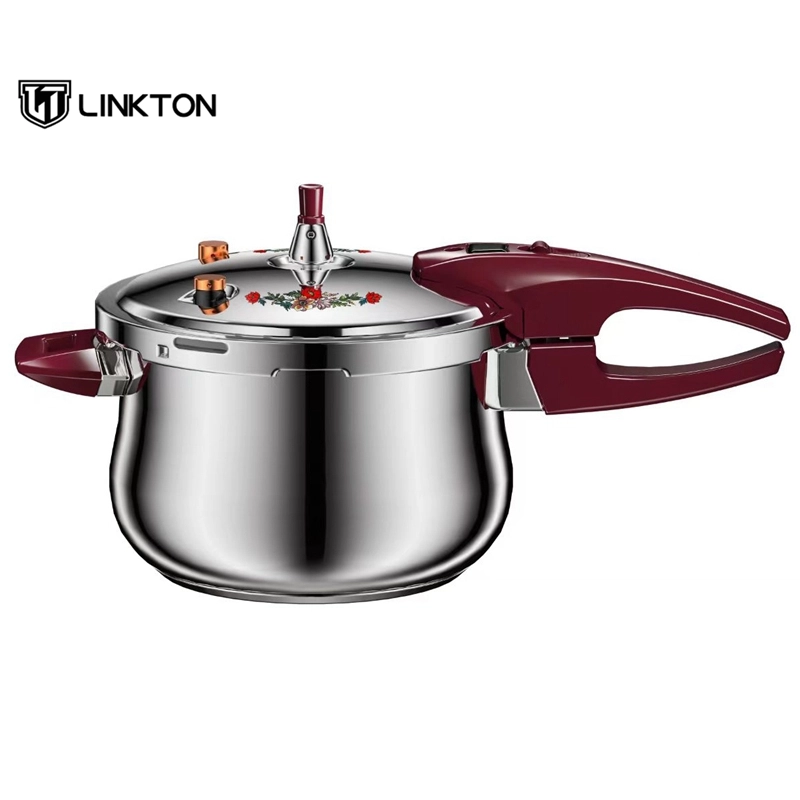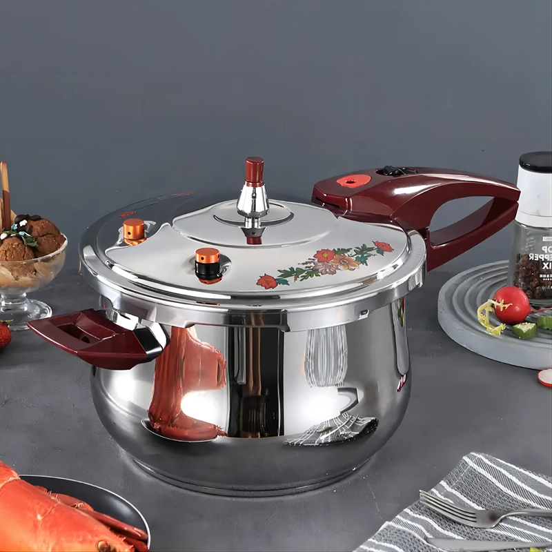 Wholesale China pressure cooker, made of high-quality stainless steel, with a polished surface and rose patterns, a red handle, beautiful and practical. 6-11L capacity opinions, large capacity suitable for any scene. Bulk supply, support OEM customization, welcome to inquire!